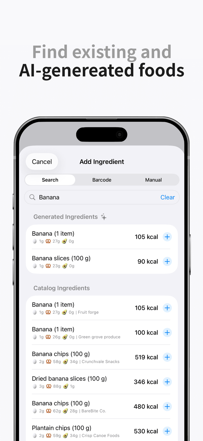 • Add ingredients manually, ask AI to fill in the rest