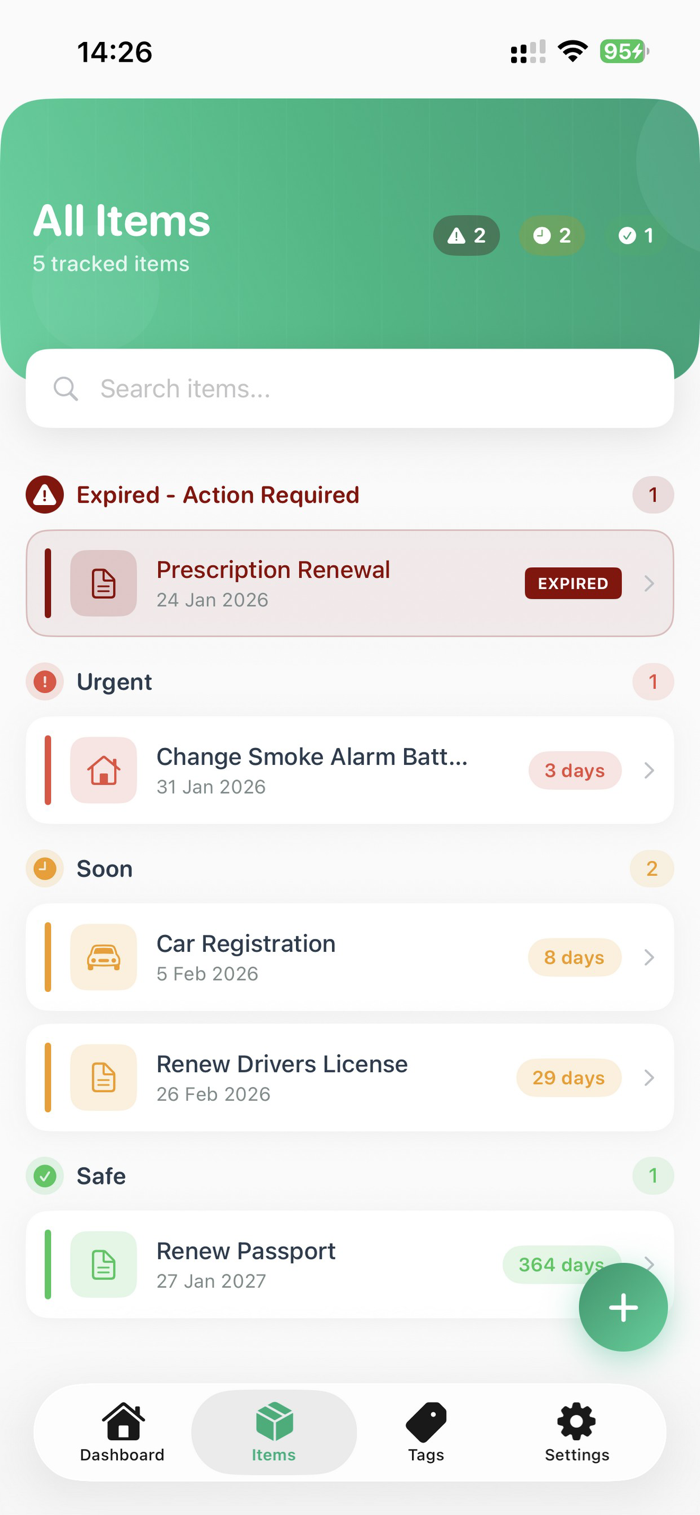 - 颜色编码的紧急程度系统:已过期、紧急、即将到期和安全
