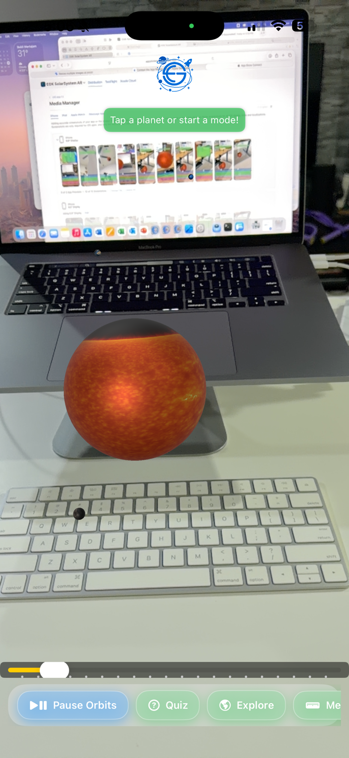 Download EGK SolarSystem AR from the App Store today! Point your device at a flat surface, and watch the solar system come alive. Toggle between modes—quiz, rocket, exploration, or measurement—and start your cosmic journey. Share your discoveries with friends or use it in lessons. The universe is yours to explore!