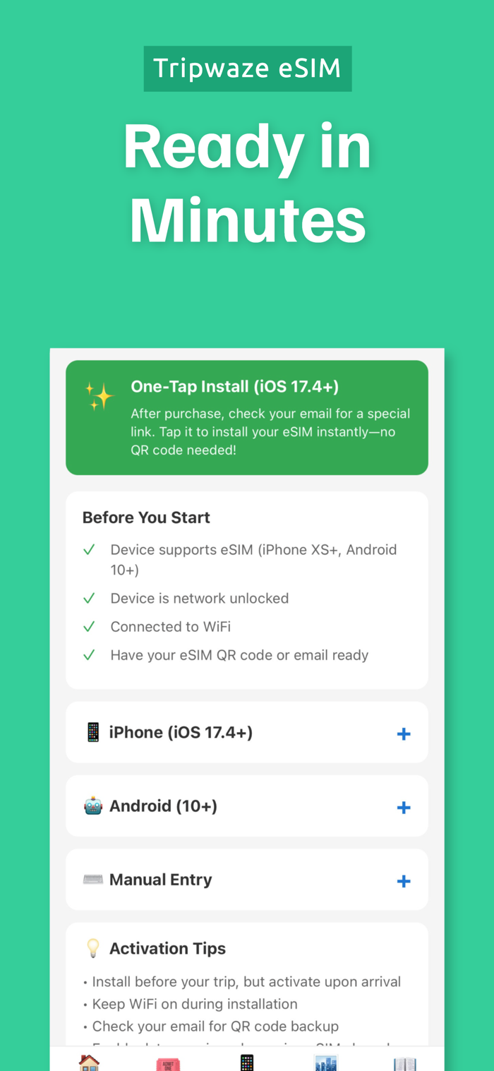 Tripwaze让你告别昂贵漫游费和实体SIM卡。通过eSIM技术提供全球移动数据即时访问,落地即连。无论工作出行还是探索新城市,在200+国家和地区有高速数据套餐。可保留原号码通话,用Tripwaze享实惠本地数据价。具备即时激活、无隐藏费用、保留号码、全球覆盖、安全便捷等优势,下载应用选目的地几分钟就能安装eSIM,通过网络优化结账购得最佳费率套餐。