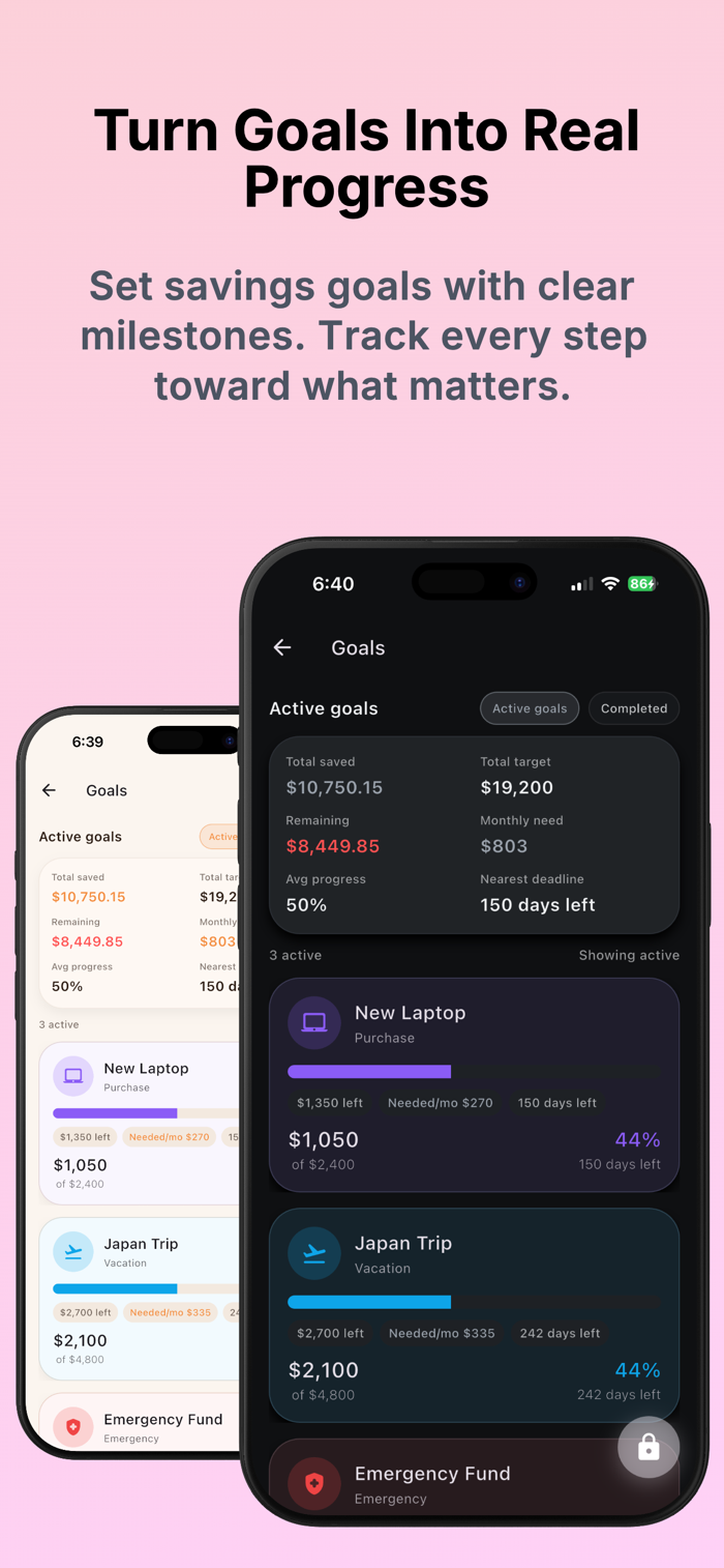 - Savings goals with progress tracking and contribution management
