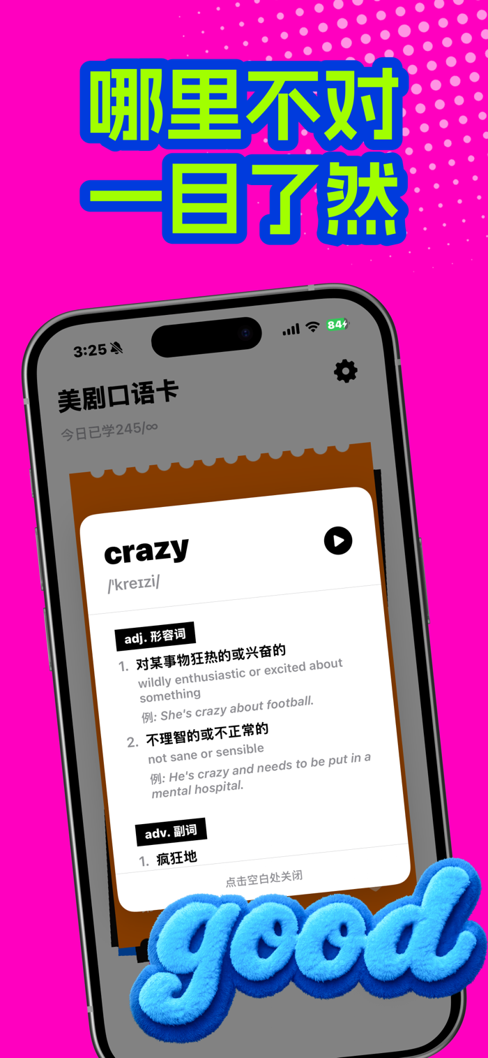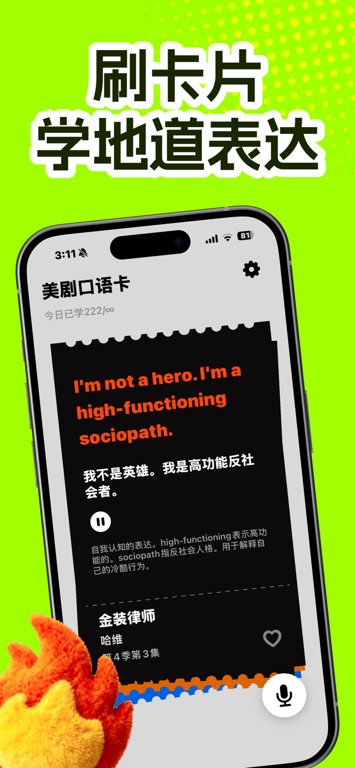 美剧口语卡通过刷卡片轻松学地道美剧口语。精选热门美剧经典台词,卡片含英文原句、中文翻译等。核心功能有卡片式学习,左右滑动高效学;AI发音评分,跟读实时分析发音并提建议;原声朗读,专业配音可男女声切换;单词点查,点击查释义发音;卡片收藏,一键收藏随时复习。免费用户每天学10张,升级Pro会员解锁无限学习。