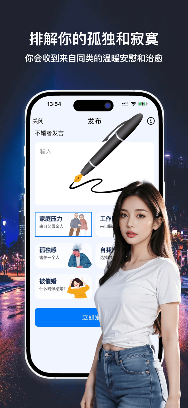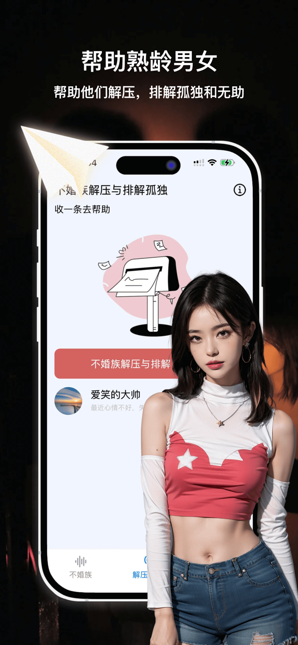 这是一款专门为不婚族人群精心打造的简洁易用的解压与排解孤独的软件。在这个社会中,不婚族们常常面临着来自各方面的压力与挑战,他们勇敢地坚守自己的生活选择,却也渴望有一个可以倾诉内心、获得理解与支持的地方。这款软件正是为了满足他们的需求而诞生。