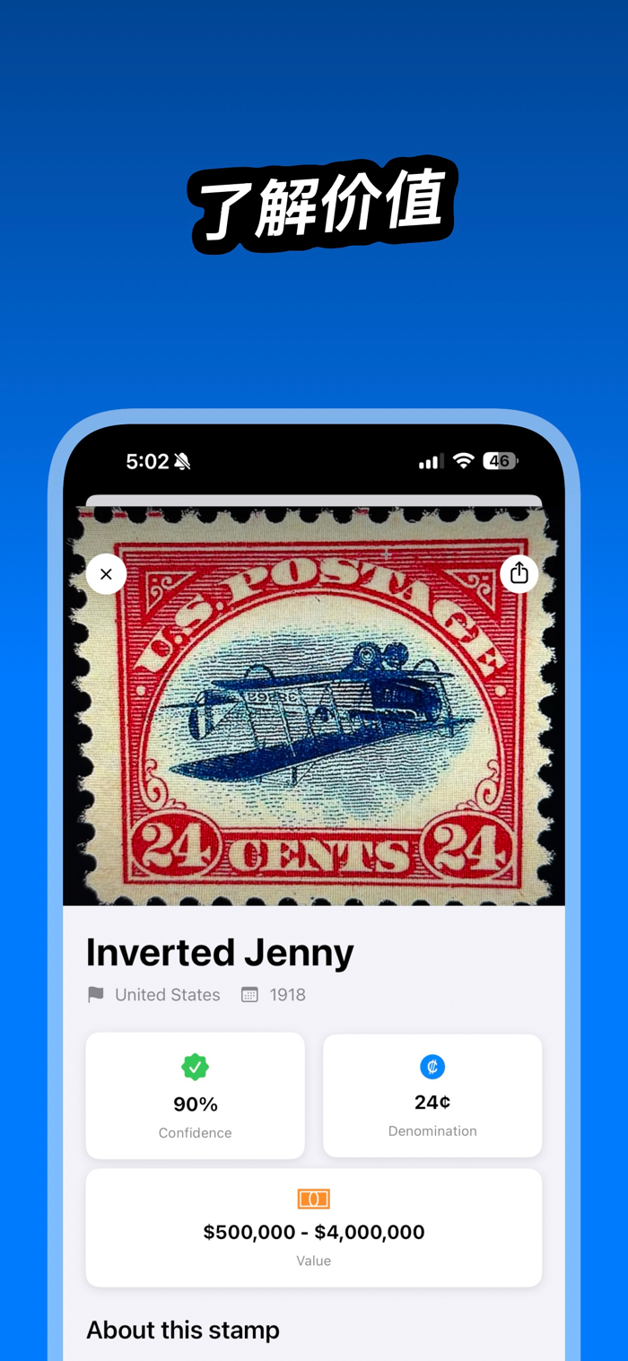 只需拍下邮票照片,即可获得可能匹配的票品、关键信息和预估价值,更好地理解和管理你的邮票收藏。