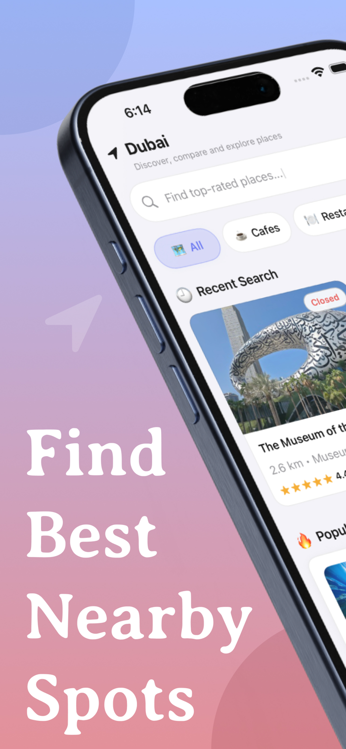 Whether you're looking for a quiet cafe, a buzzing restaurant, a local park, or a hidden gem, Placevu instantly surfaces the best options near your location — sorted by distance, filtered by category, and packed with the details you actually need.