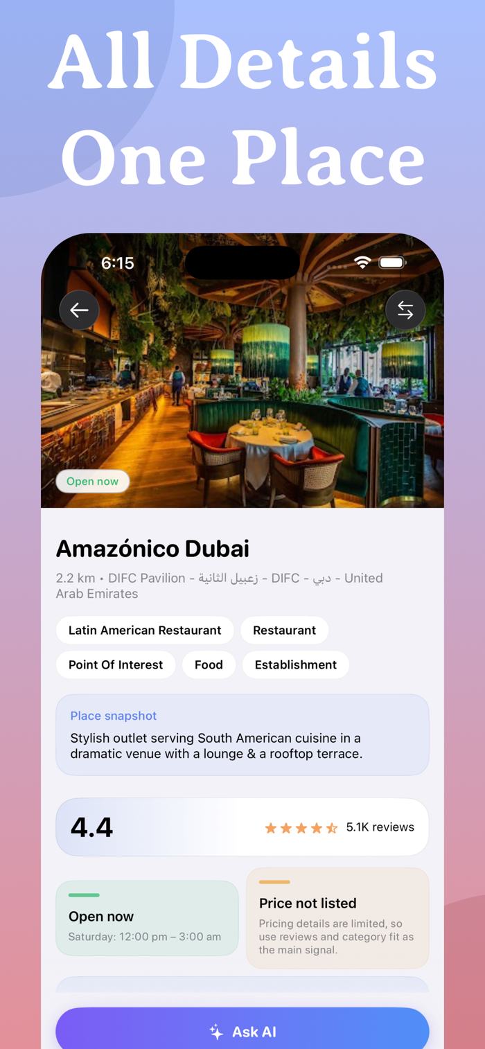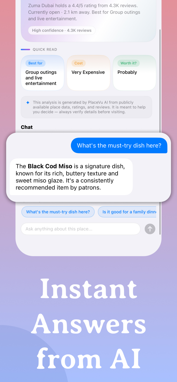 Get instant, AI-powered insights for any place. See personalized tips, a smart verdict, what stands out, things to watch for, and a full cost breakdown. Ask follow-up questions in a live chat and get answers instantly.