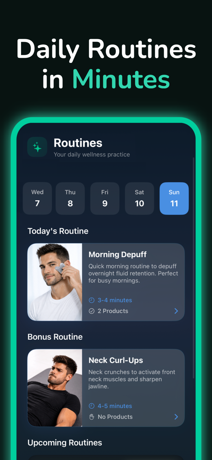 • Personalized Routines - Morning and evening depuffing exercises tailored to your face. Face yoga, lymphatic drainage massage, and jawline sculpting techniques.
