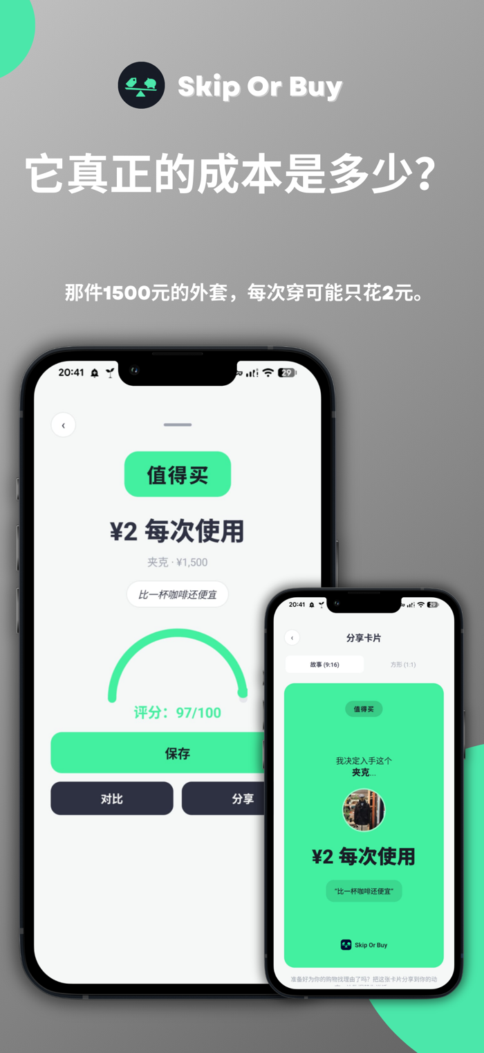 大多数预算应用问的是"你买得起吗?"Skip Or Buy 问的是一个更好的问题:"按每次使用的费用来算,这真的值吗?"