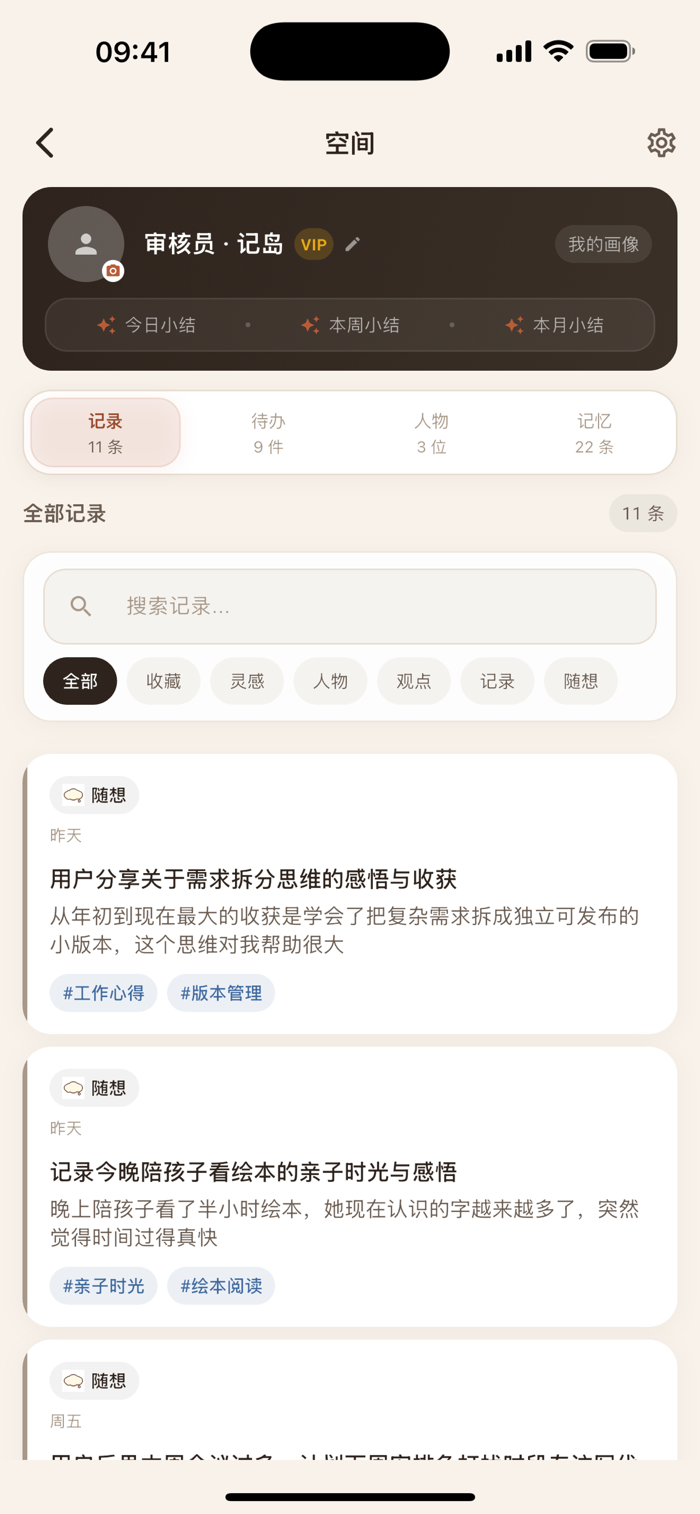 每周末,小记会帮你总结:这周记录了什么、遇到了谁、情绪如何、有什么值得回顾。不是干巴巴的统计,而是带有温度的回顾。