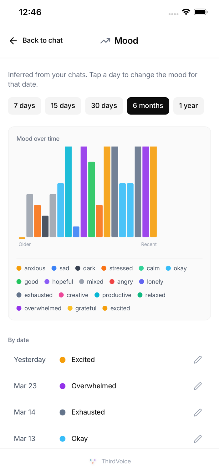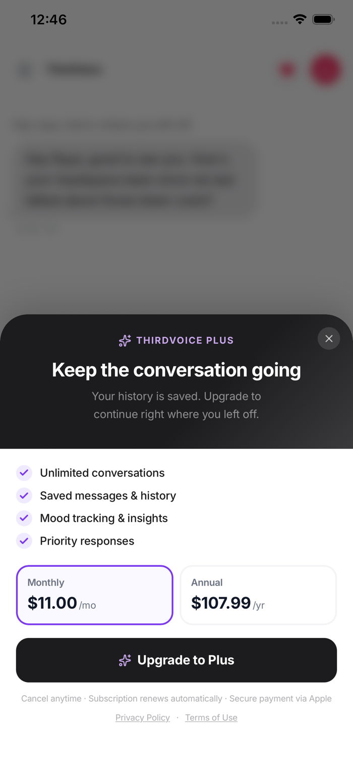 ThirdVoice is not a replacement for professional therapy or medical advice. If you are in crisis, please use the in-app SOS feature to connect with professional resources.