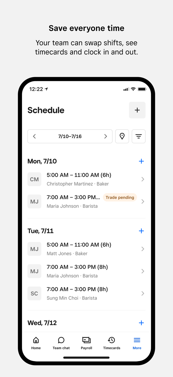Square Team app is the one place for your team to communicate, manage schedules, access timecards, and stay in sync — all on the go. It also allows them to see their hours worked, breaks, overtime, and estimated pay.