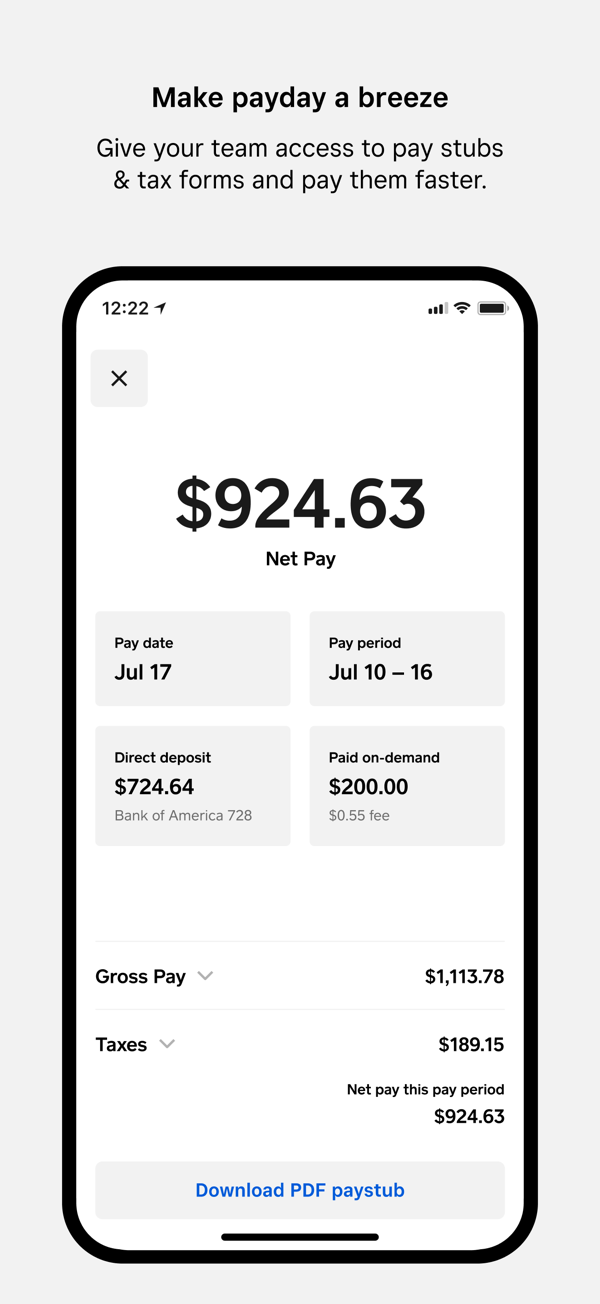 Built for businesses using Square, the app enables employees to clock in and out on their phones instead of at the POS, which saves time and eliminates the need for team members to crowd around the POS to clock in. Employers can manage teams more easily, adjust schedules, and empower their employees by putting critical shift information at their fingertips. And if team members are paid through Square Payroll, they have access to their pay stubs and tax forms right on their mobile phones.