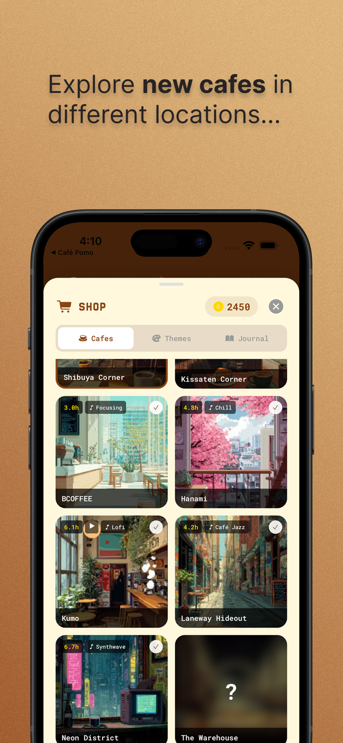 Start your journey in NYC, then earn coins to unlock cafes around the world Tokyo, Europe, and mysterious fantasy realms. Each city holds multiple unique cafés waiting to be discovered. Where will you study today?
