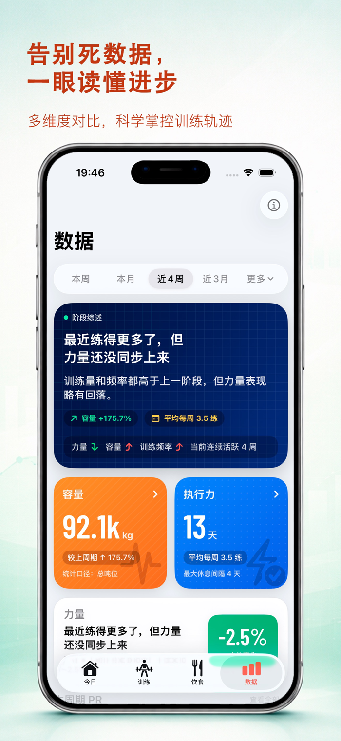 - 查看力量、训练量与一致性数据