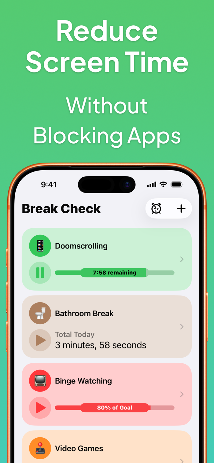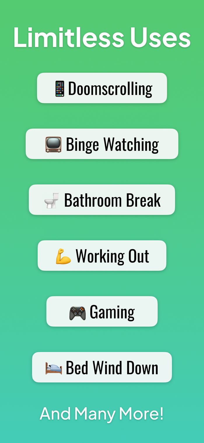 — Bathroom Breaks: Even five minutes in the bathroom deserves a limit. Launch instantly from your Action Button or Control Center.
