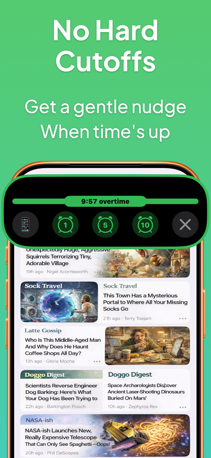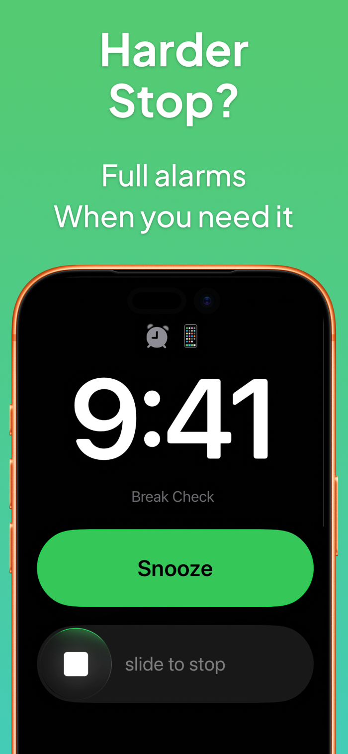 当你的会话结束时,你会收到一条温和的通知,计时器会继续计时,没有硬性截止。需要更多时间?只需轻点即可延长。对于需要更严格界限的习惯,你可以改用全面闹钟。