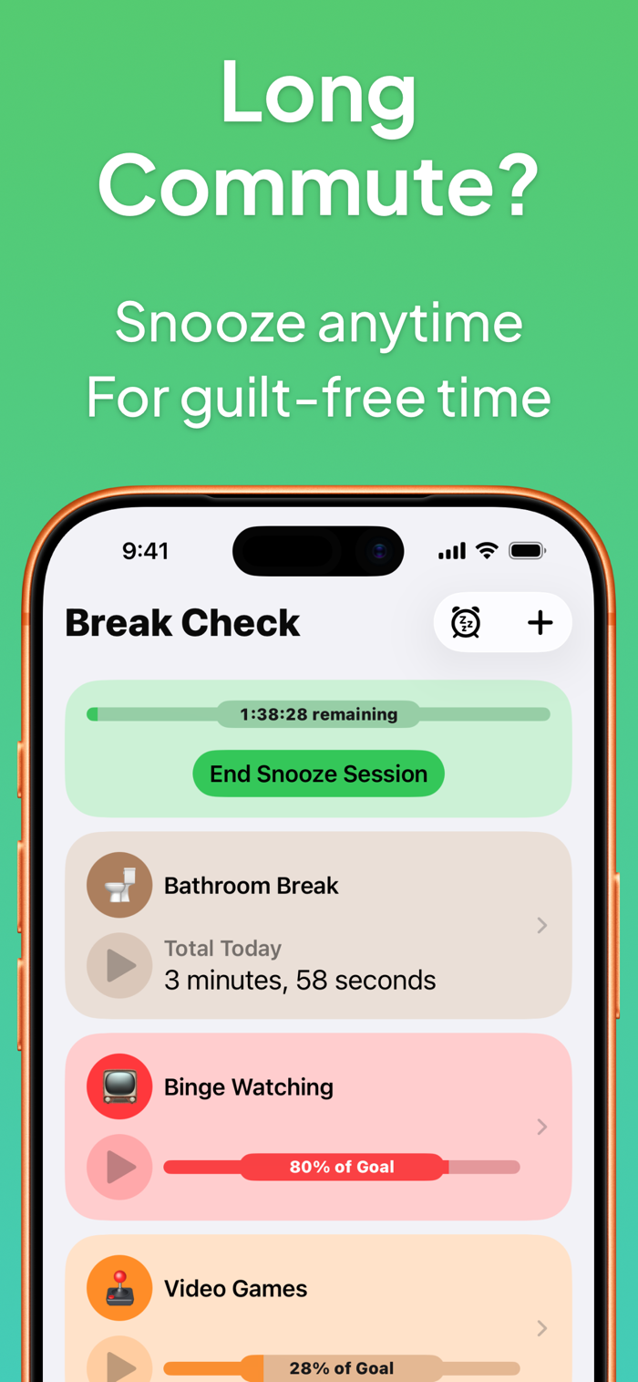 Waiting at the DMV? Long commute? Snooze all your timers whenever phone time is unavoidable. No streaks broken, no pressure.
