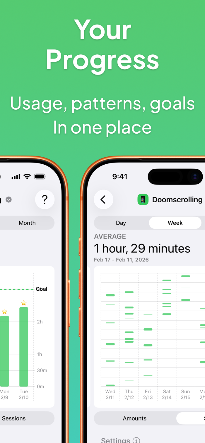 Set a session length and a daily goal for any habit. Your time is broken into real sessions, not just a daily total, so you can see exactly when you used your phone and for how long. Pause and resume anytime, right where you left off.