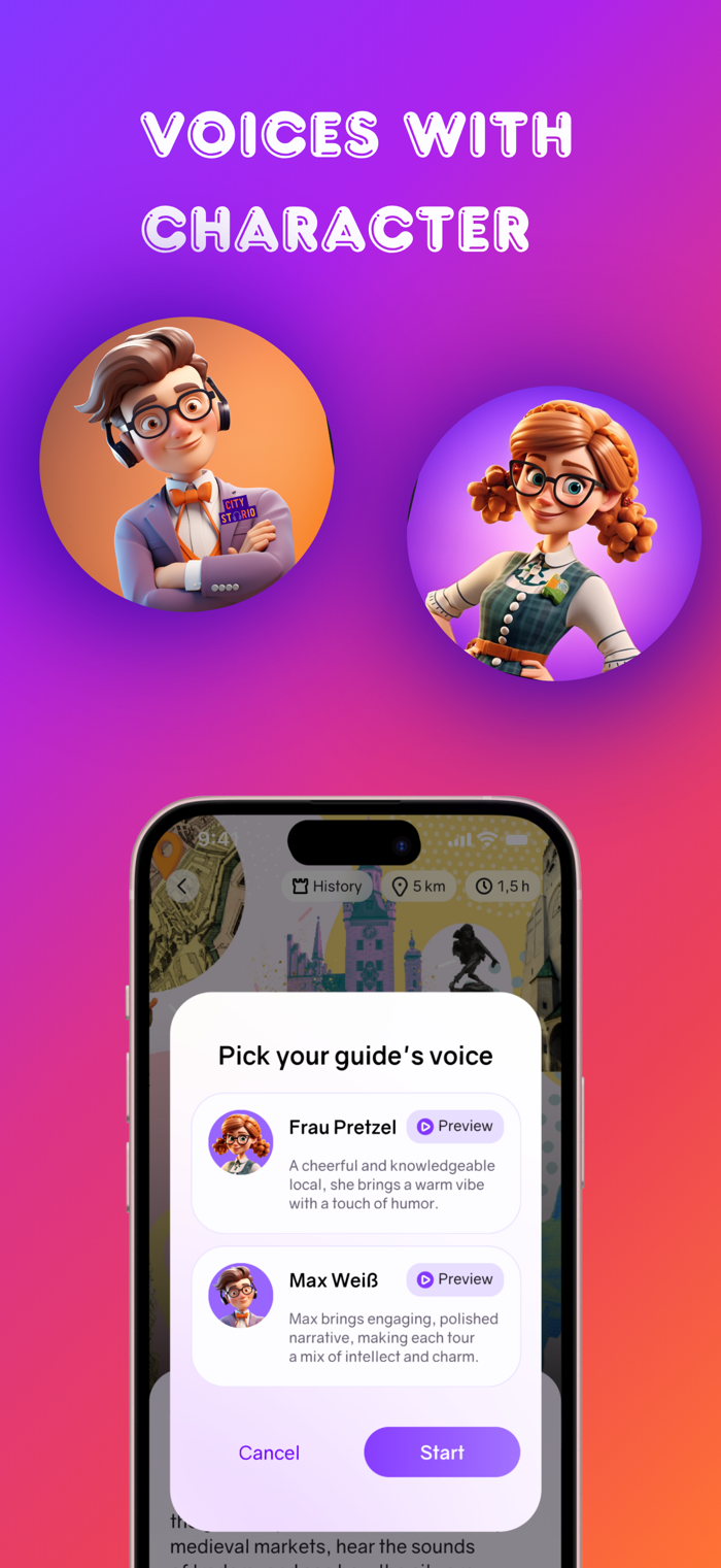 • Choose your guide — Frau Bretzel or Max Wurst