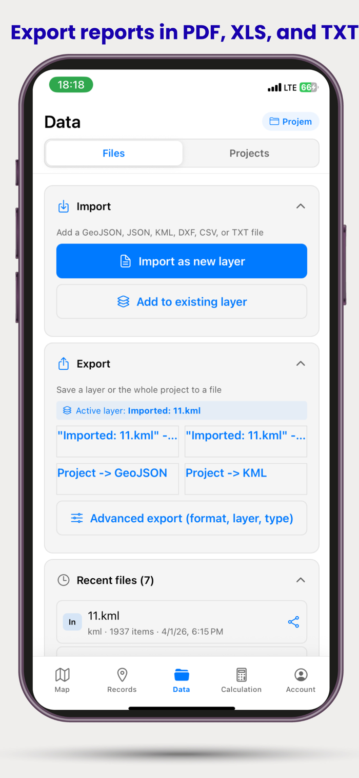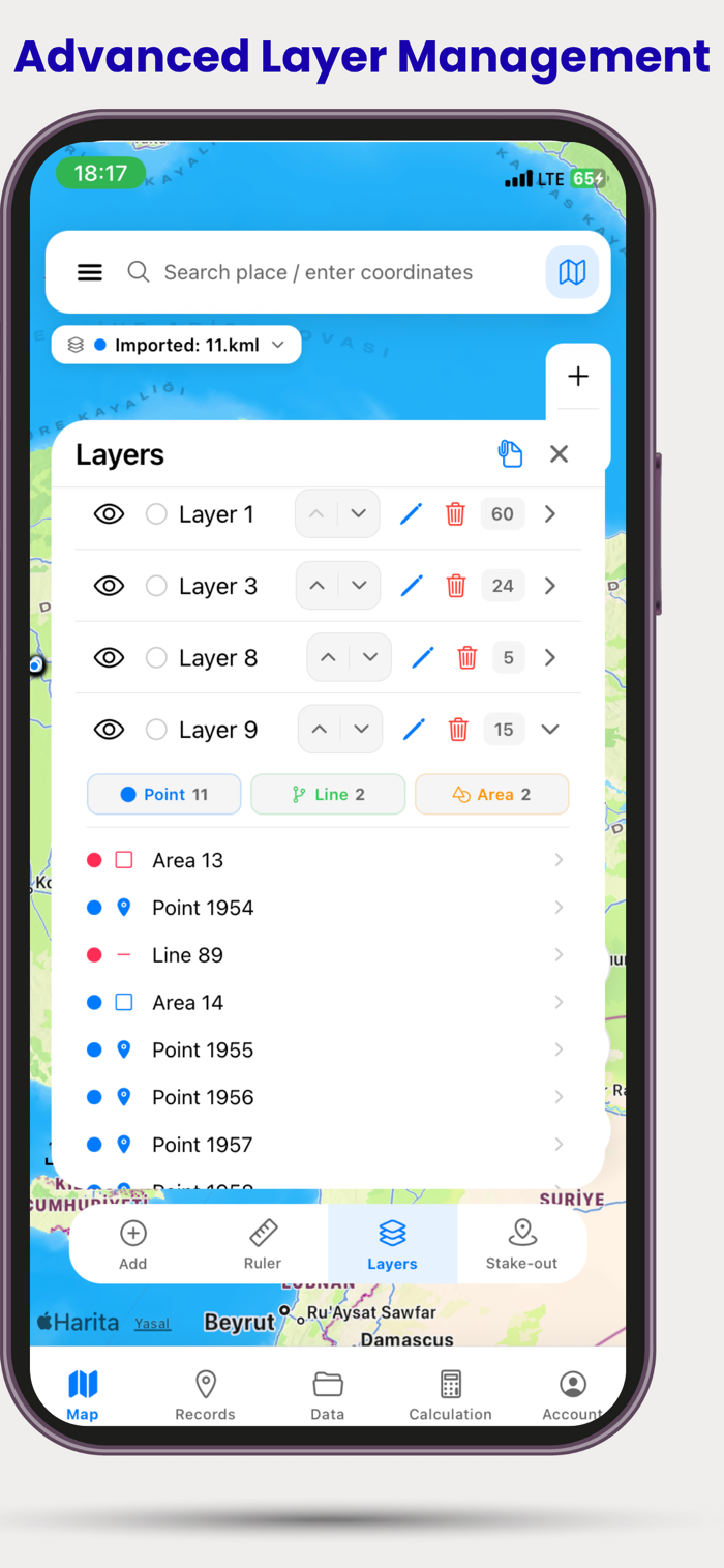 您可以在地图上绘制点、线和多边形,高精度测量距离和面积,使用全球坐标系统(如 WGS84、UTM、ED50 和 TUREF),导入 KML、DXF 和 GeoJSON 文件,并创建专业报告——所有功能集成在一个应用中。