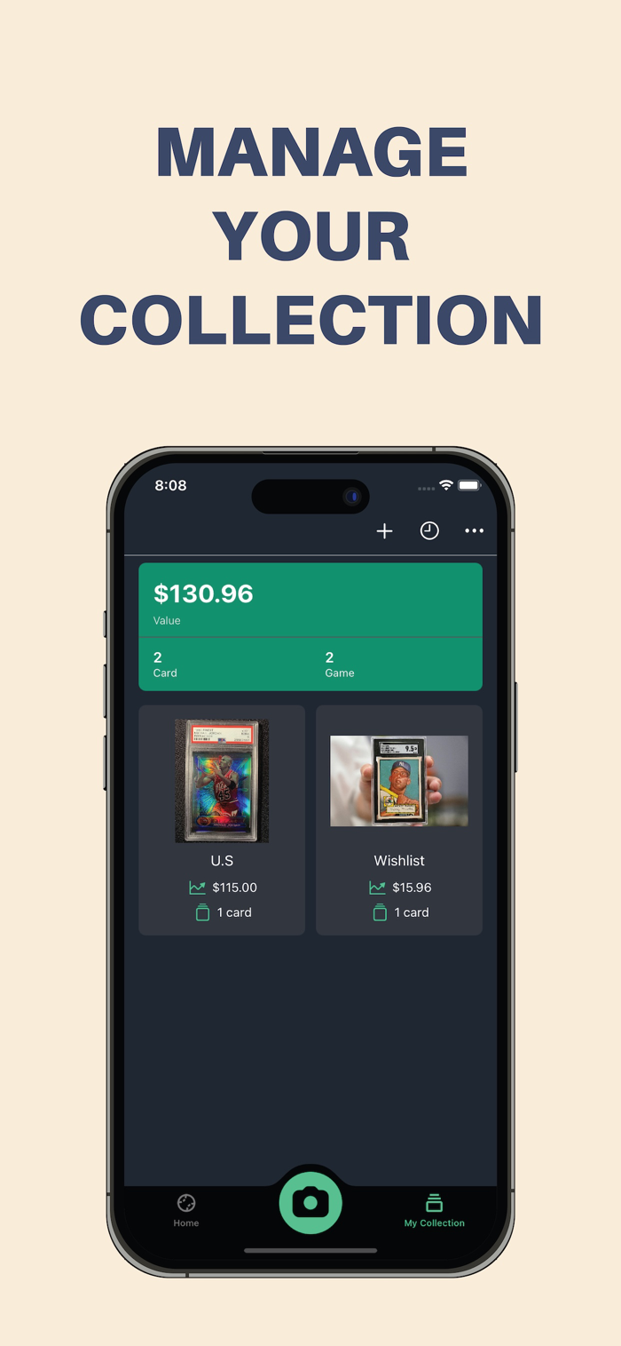 Collection Management — Save scans, track total value, and monitor your collection’s growth.