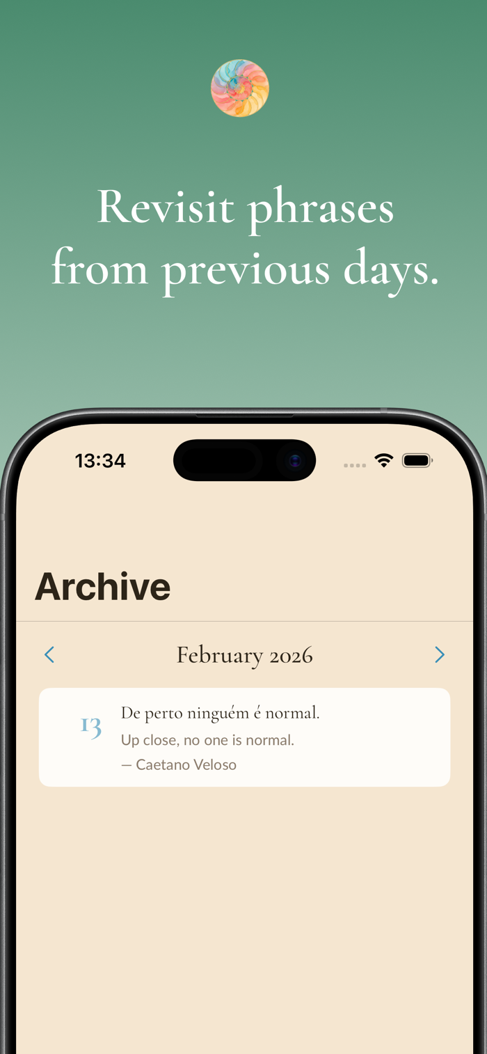 The name comes from December, the last month of the year, a time for reflection and taking stock. A moment to look back and inward. The app carries this spirit: each quote is an invitation to pause amid the rush and find an instant of depth. December also marks the summer solstice in Brazil, so it's a time of great happiness and harmony.