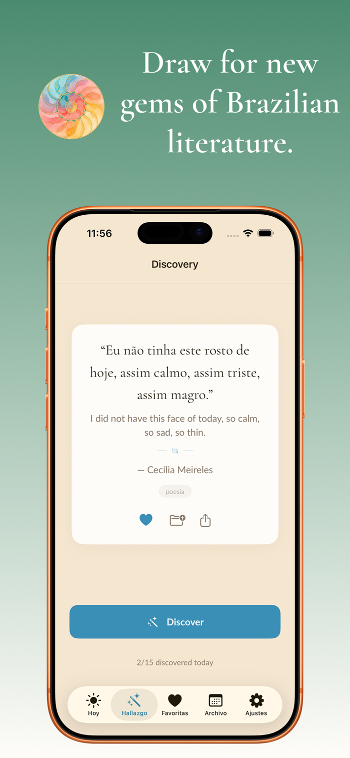 Every day, a selected quote from Brazilian literature appears for you. These are thoughts from Guimaraes Rosa, Carlos Drummond de Andrade, Clarice Lispector, Manoel de Barros, Cora Coralina, Ailton Krenak and over 100 writers, poets and thinkers who shaped the soul of Brazil.