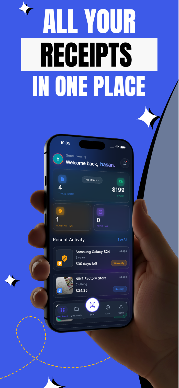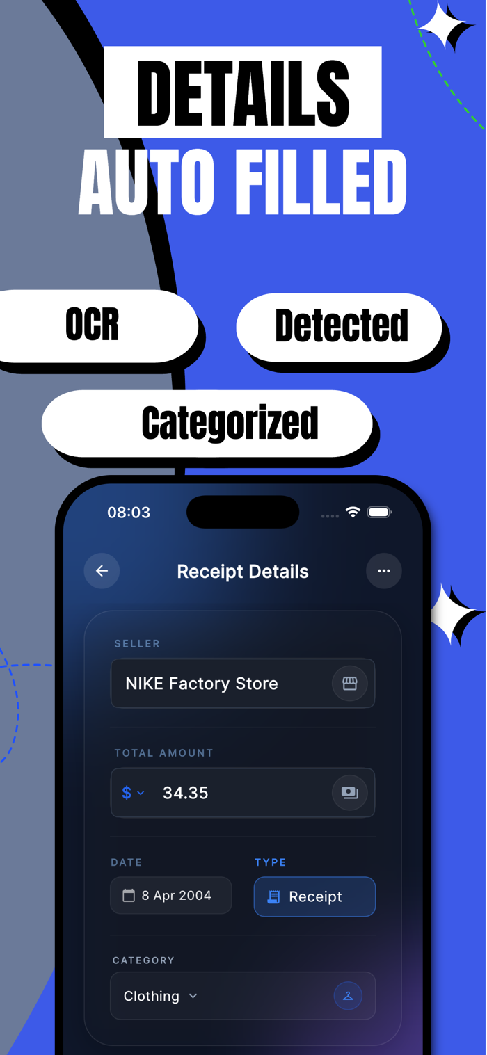 Scan receipts, invoices, and warranty documents with AI. Rulo automatically extracts important details like seller name, amount, date, category, and document type, so you can save time and keep everything in one place.