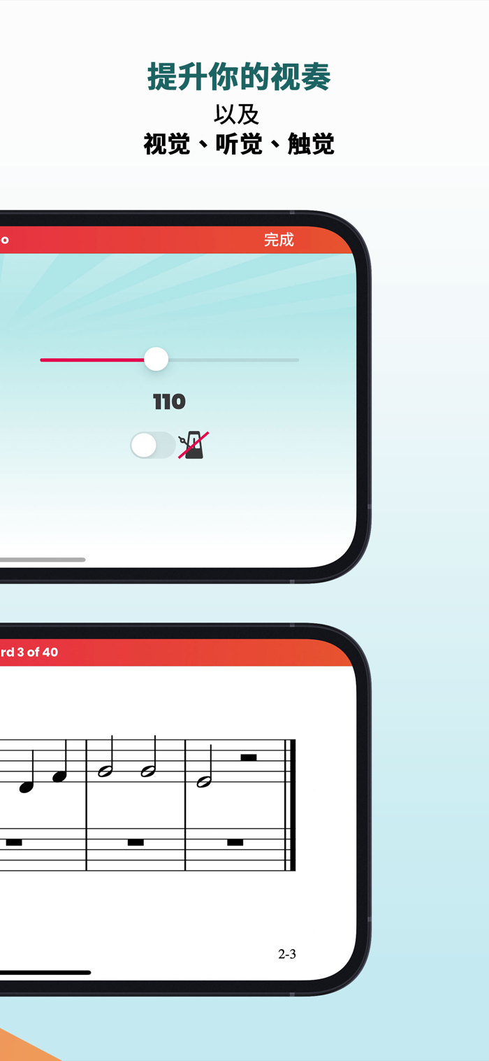 2. 视奏 练习(Sight Reading) 一 数以百计的练习触手可及!内置录音可检查你的准确性 (此部分为单独订阅升级)。