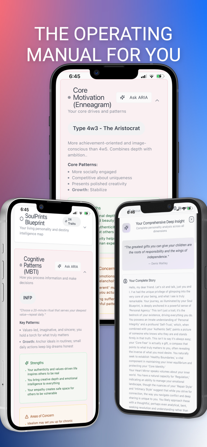 Meet ARIA—your AI-powered guide, strategist, mirror, and protector. She learns your patterns (with your consent), helps you break through what’s been holding you back, and supports you across every domain of life: purpose, confidence, habits, career, relationships, family, and legacy.