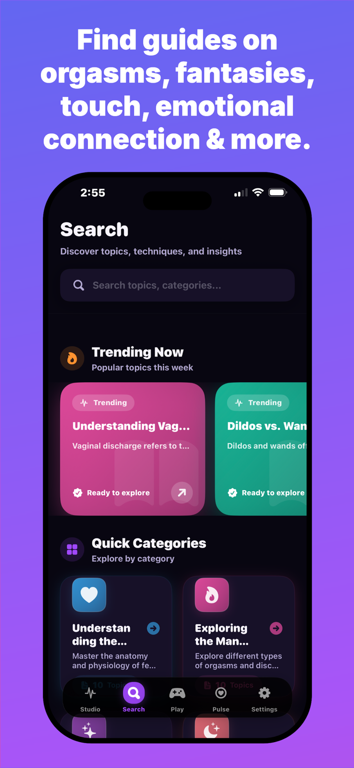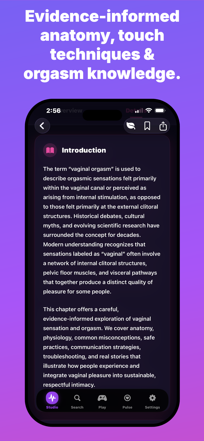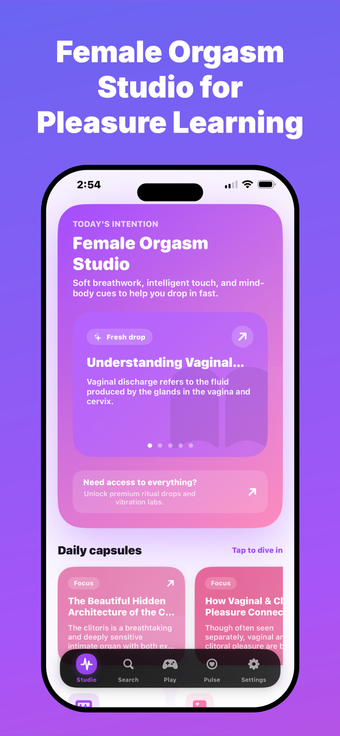这是一款基于科学的女性学习应用,提供私密安全空间,助其了解女性高潮、愉悦、亲密及整体健康。有100+详细主题、10个高潮教育类别、10个健康指南、20种放松模式和4种精美主题。为想更好了解自身身体的女性打造,涵盖理解女性高潮、唤起阶段、高潮困难原因等内容,提供基于健康科学的简单清晰见解。