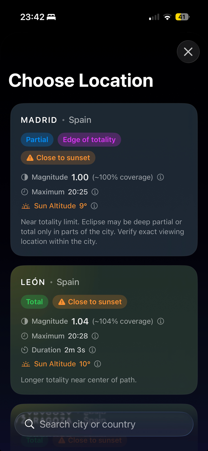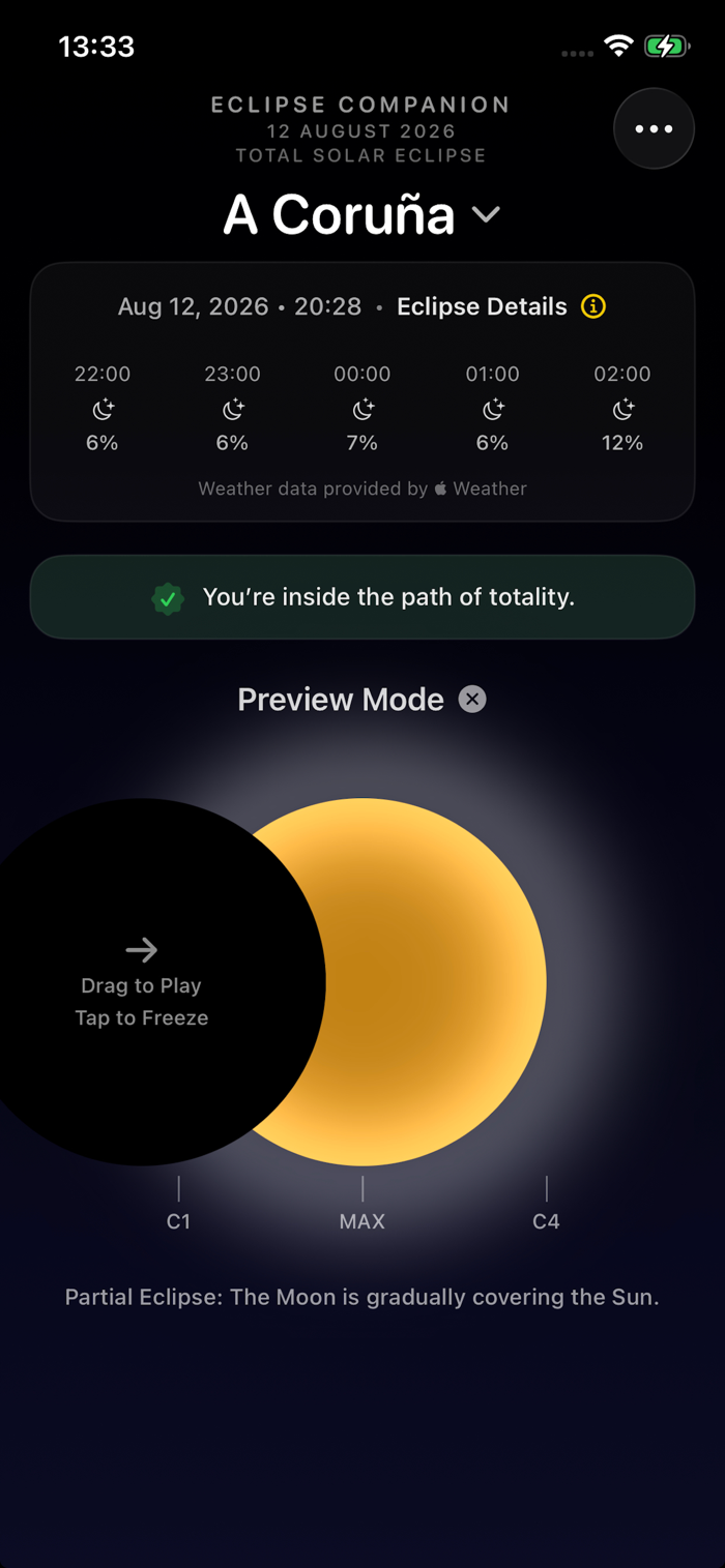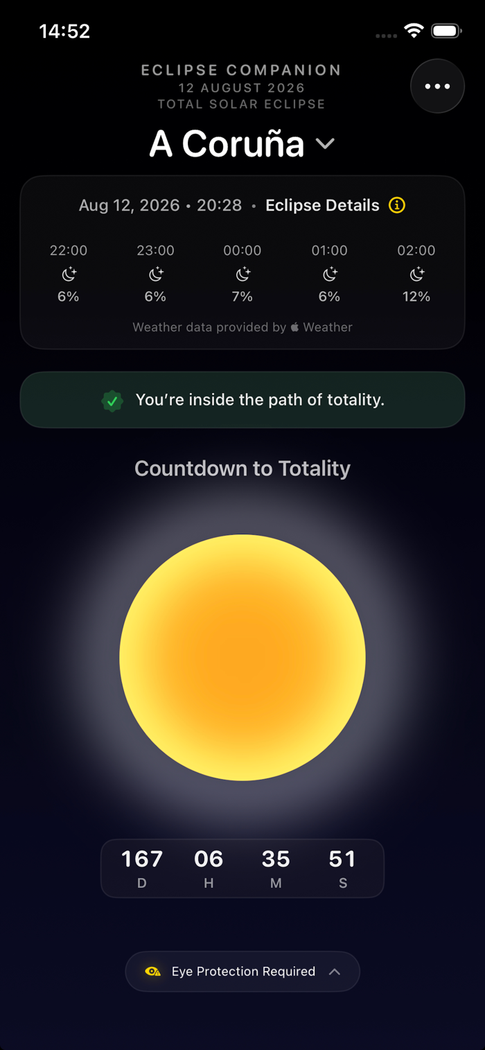 Eclipse Companion是精准指引2026年8月12日日全食的应用程序。为欧洲观测者设计,提供精准当地时间、全食带可见性、逼真实时日食动画及天空状况等,均依你所在位置定制。有英、西、葡语版本。具备基于位置的日食数据,如是否在全食带内、欧洲支持城市的最大日食时间等;有天空晴朗度预报,含每小时云层覆盖概况等;还有实时日食模拟及智能提醒功能。