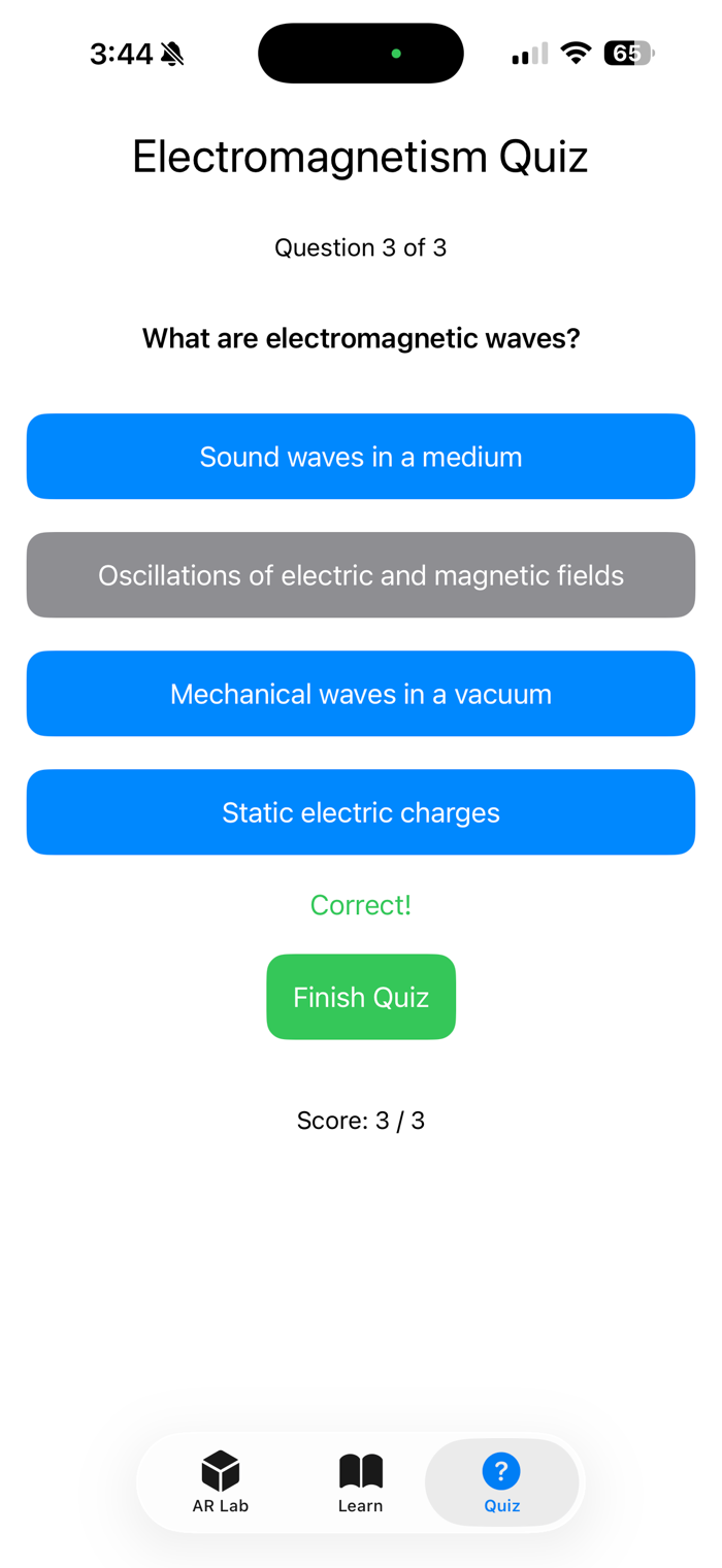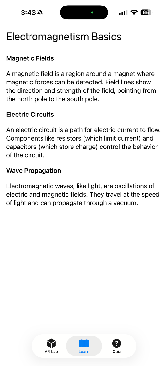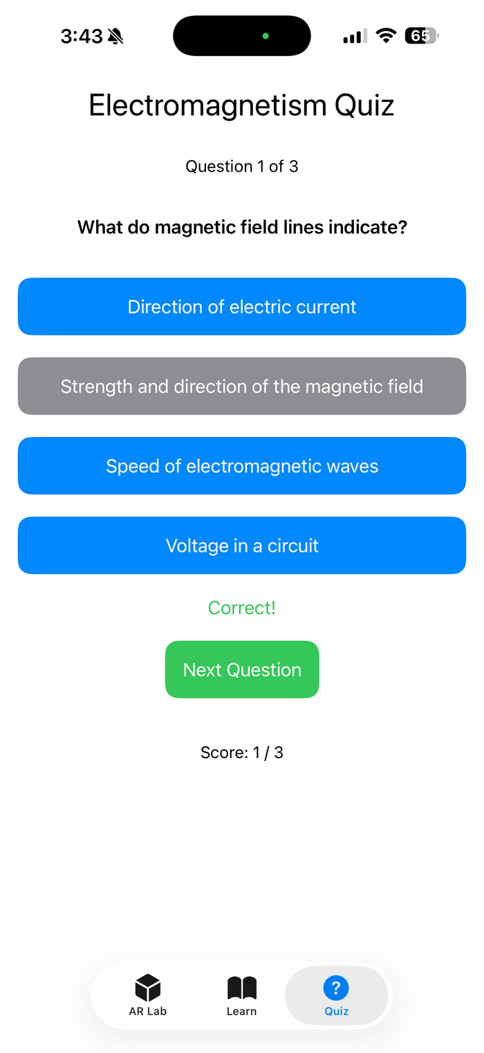 EGK MagnetoLab bridges theoretical physics and hands-on learning by visualizing abstract concepts like magnetic fields and wave propagation in AR. The learning chapter lays a solid theoretical foundation, while the quiz promotes active recall and application. Its intuitive TabView interface, with AR Lab, Learn, and Quiz tabs, ensures seamless navigation for students and educators. Built with SwiftUI, the app delivers a modern, responsive design optimized for iOS devices.