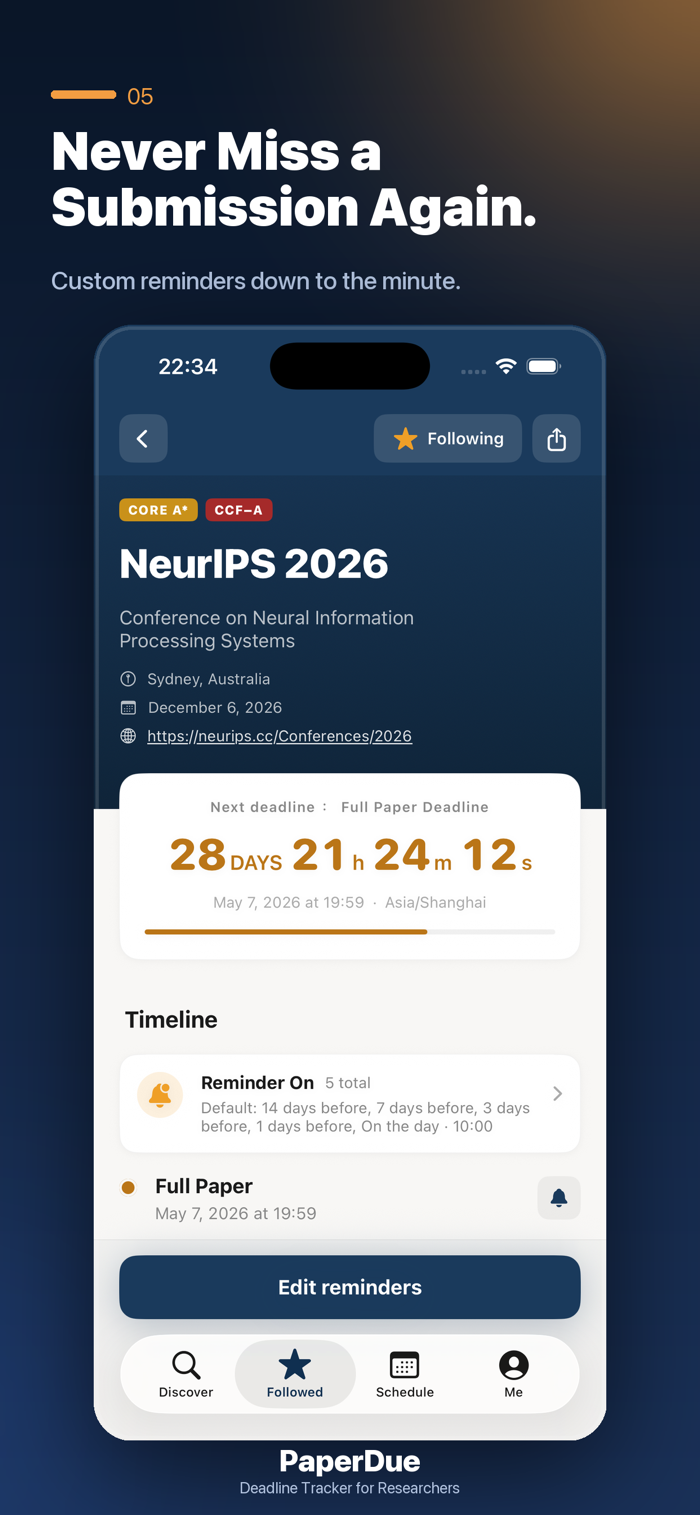 PaperDue 是为 AI 研究者、博士生和学术工作者打造的会议截稿追踪器。CVPR、NeurIPS、ICML、ICLR、ACL、AAAI、ECCV 等几百个顶会,统统收录在一个简洁、无干扰的 app 里。