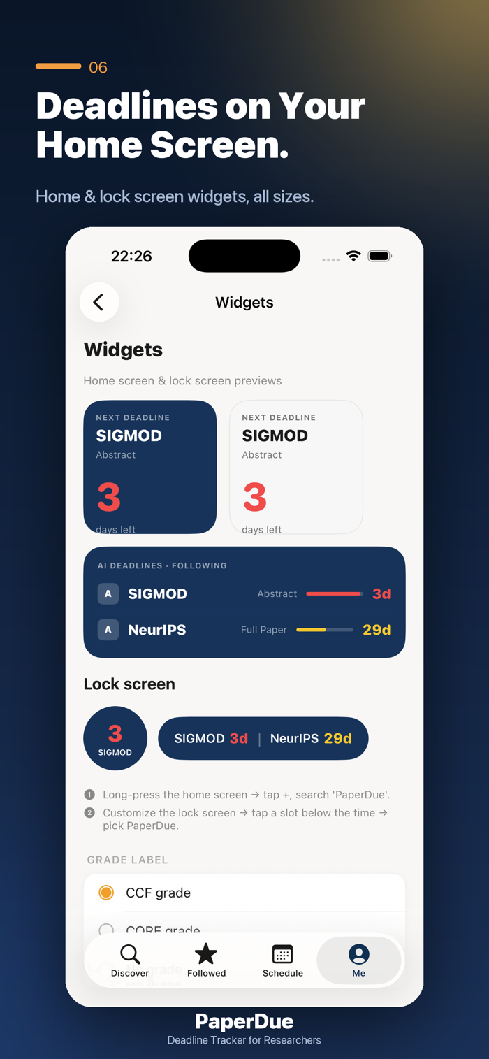 主屏和锁屏小组件:不打开 app 就能看到下一个截稿。多种尺寸可选,带实时进度条。