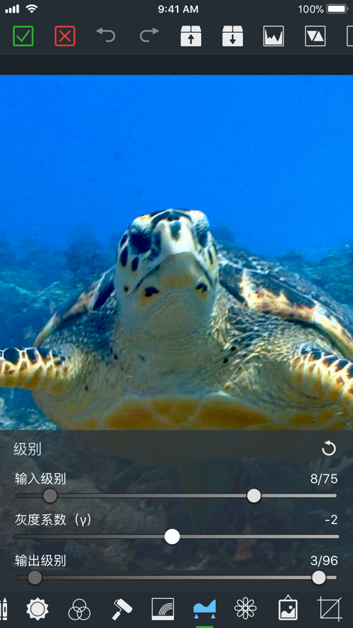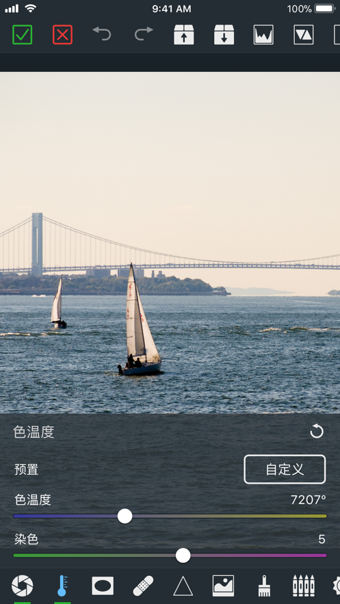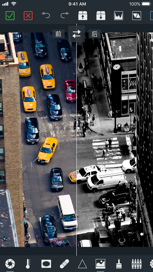 曝光量, 对比度, 鲜艳度, 色温度, 晕染, 恢复, 锐度, 单色, 亮度, 饱和度, 特效, 通道混合器, 染色。
