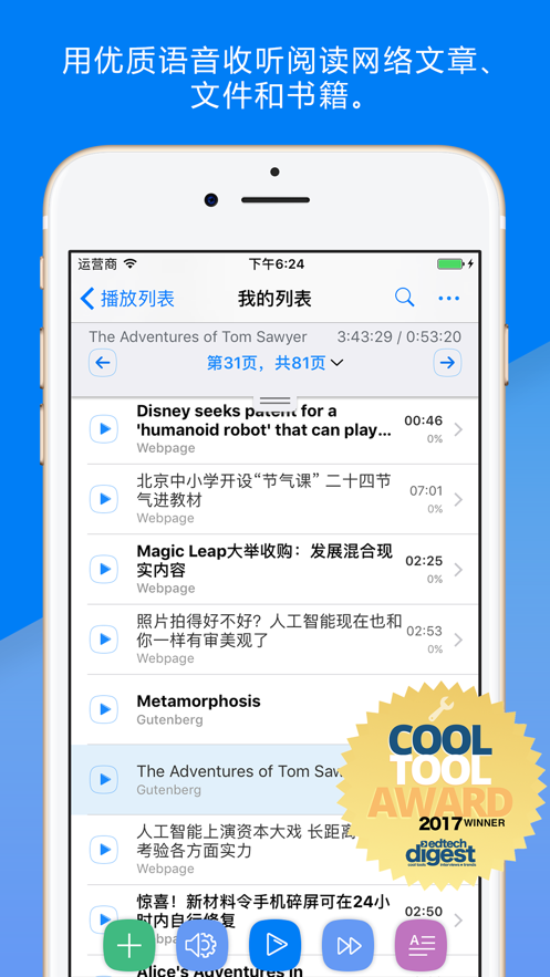 * 点击+按钮添加任何文章到播放列表,立即收听或保存供以后收听