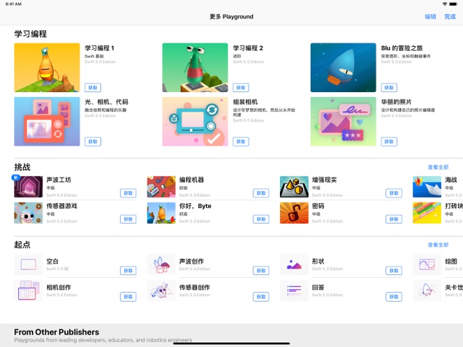Swift Playground 让学习编程和构建真实 App 变得妙趣横生。你可以在“编程入门”的指导下通过互动学习来闯关,并在“开始构建 App”中学习构建 App 的基础知识。你还可以尝试众多挑战及示例,从中探索独一无二的编程经验。