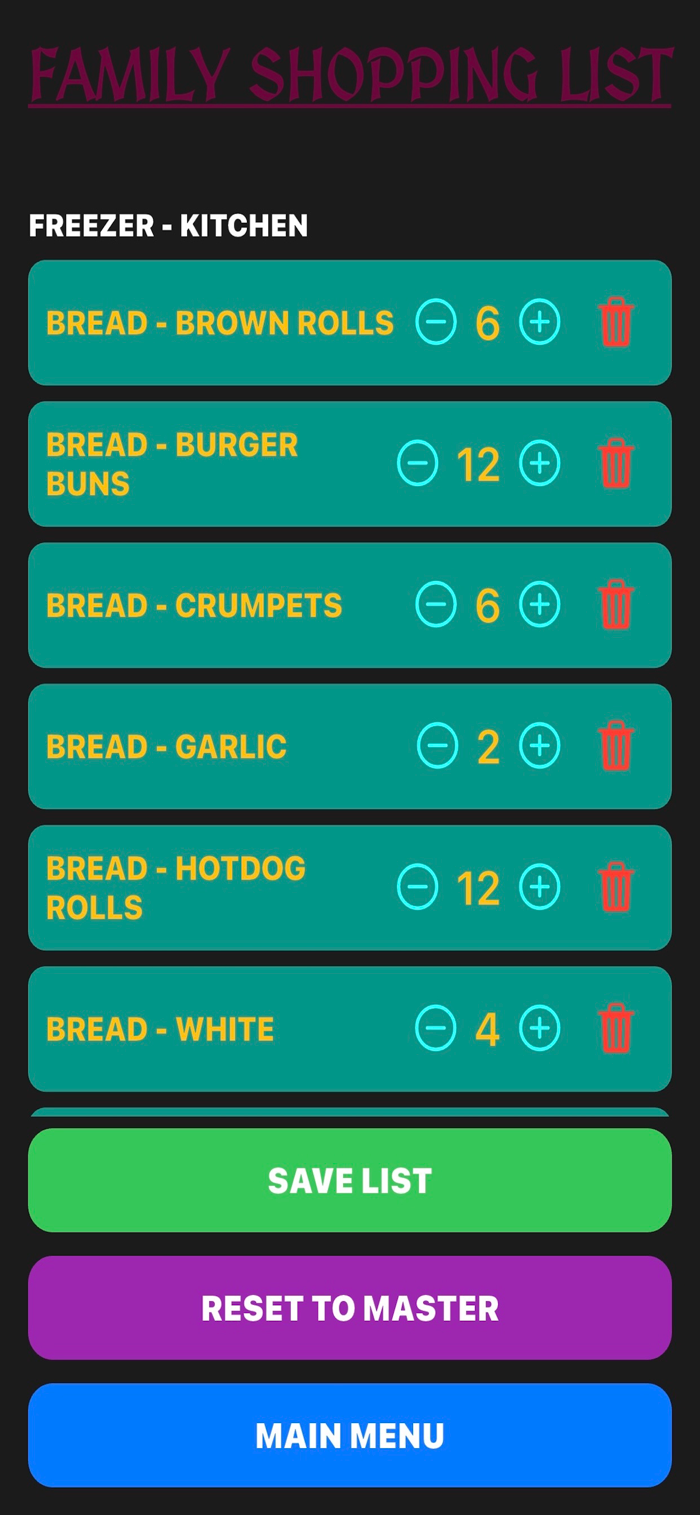 When it is time to go shopping, users can generate a simple Shopping List which compares the RUNNING COPY to the MASTER and shows what items are needed in what quantity.